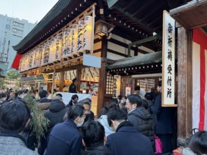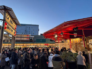 写真の通り、境内は参拝者であふれ、福笹を求める列が続く活気に満ちた状況でした。屋台や縁起物の明かりが並び、えびす祭ならではの華やいだ雰囲気が広がっていました。