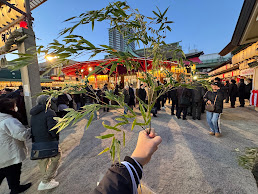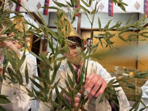本殿では福娘の方々が丁寧に笹へ縁起物を結びつけてくださり、ひとつひとつの願いが形になる瞬間を見届けました。飾られた笹は、メンバー全員の想いを背負った祈願の証です。